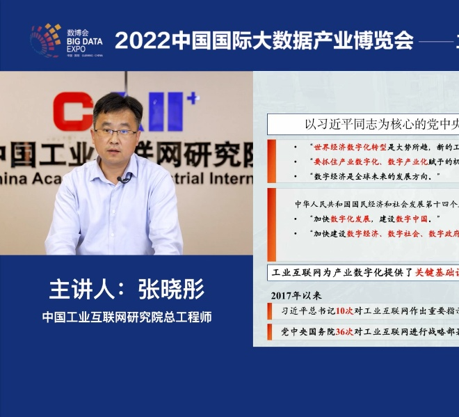中国工业互联网研究院总工程师张晓彤在2022数博会“工业互联网赋能数字化转型”论坛上作主题演讲