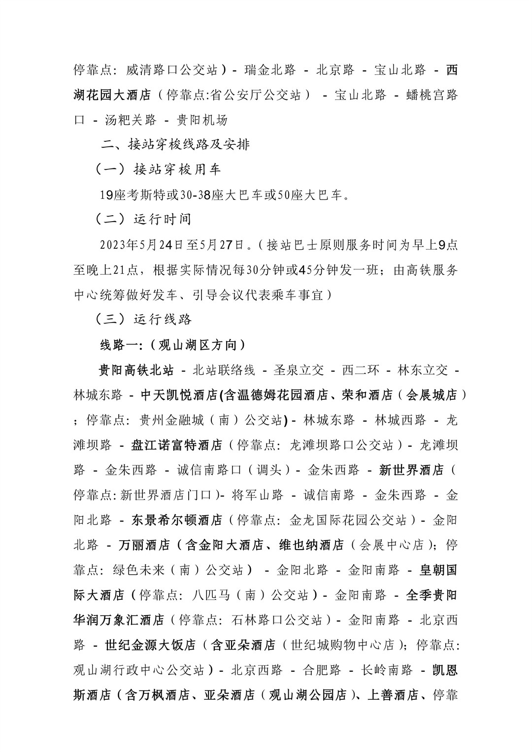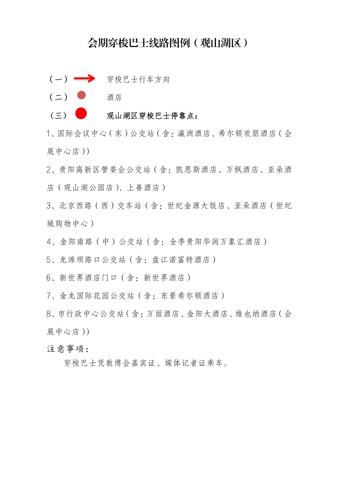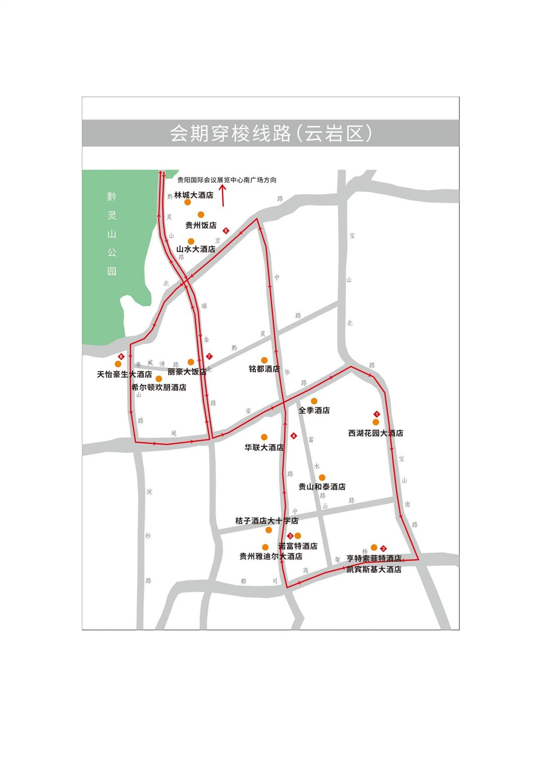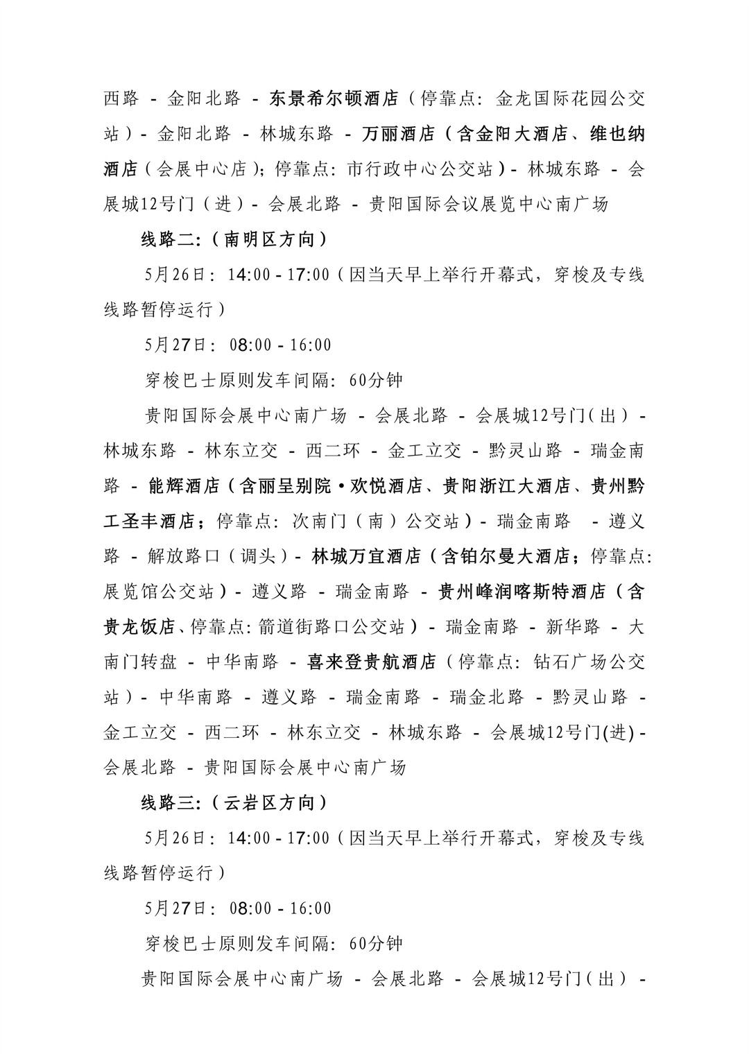 包括贵阳龙洞堡国际机场和贵阳高铁北站的接机、接站穿梭线路,涵盖观山湖区、云岩区及南明区.另外,数博会召开期间开通贵阳国际会展中心南广场往返观山湖区、云岩区及南明区各相关酒店穿梭巴士线路。